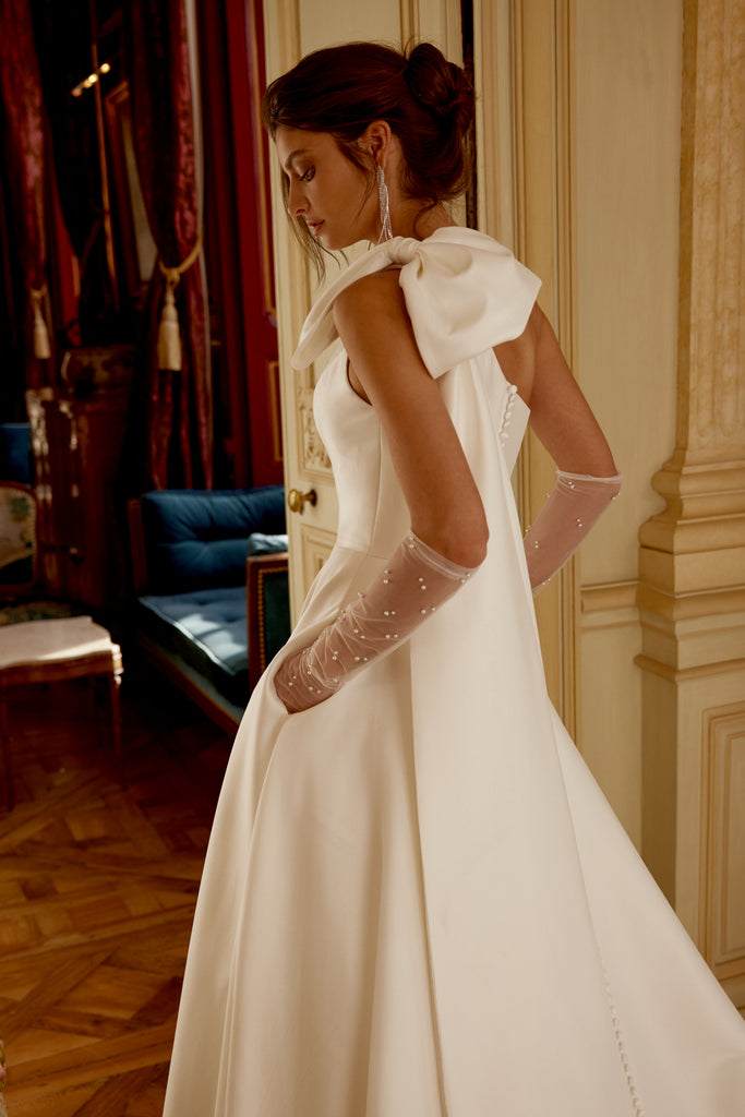 Mikado A-Line Gown with One-Shoulder Neckline and Detachable Bow