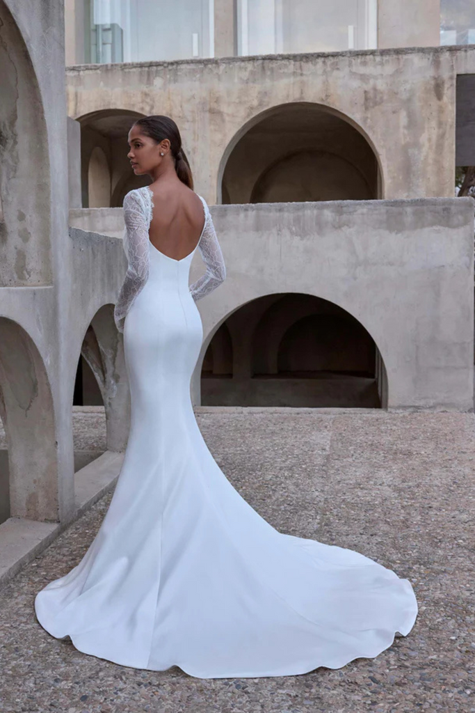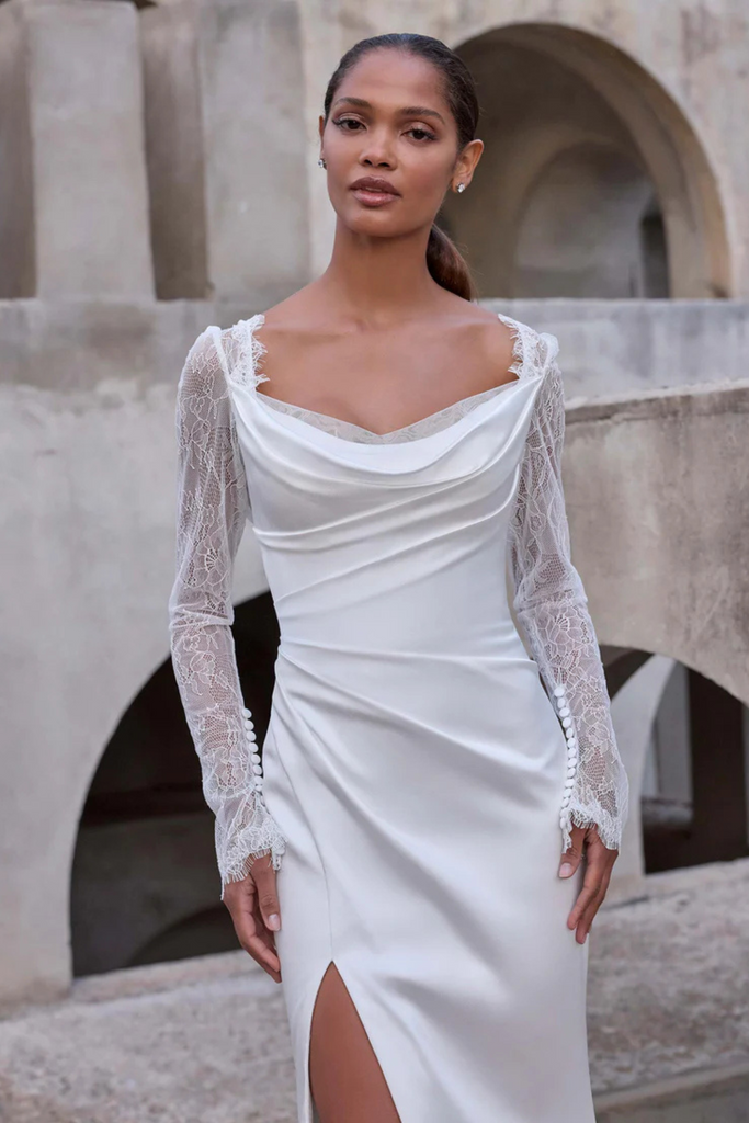 Stretch satin fit and flare wedding dress has a draped cowl neckline with detachable off-the-shoulder satin bow drape and chantilly lace long sleeves.