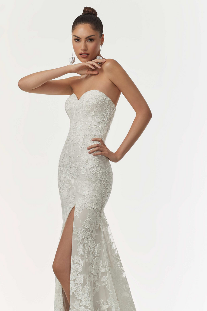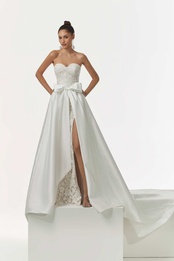 Gorgeous fit and flare has a sweetheart neckline with frosted, textured floral embroidery and a chic Larissa satin overskirt for added drama.