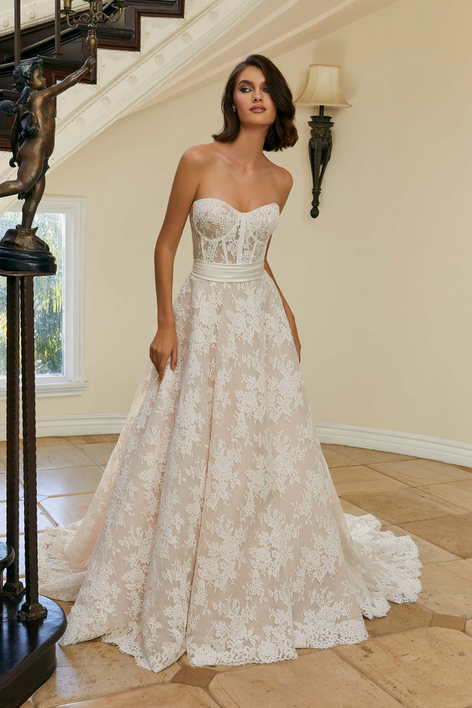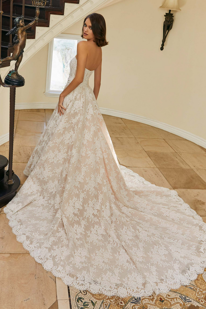 Traditional Alençon lace ball gown with corset bodice and matching lace jacket.