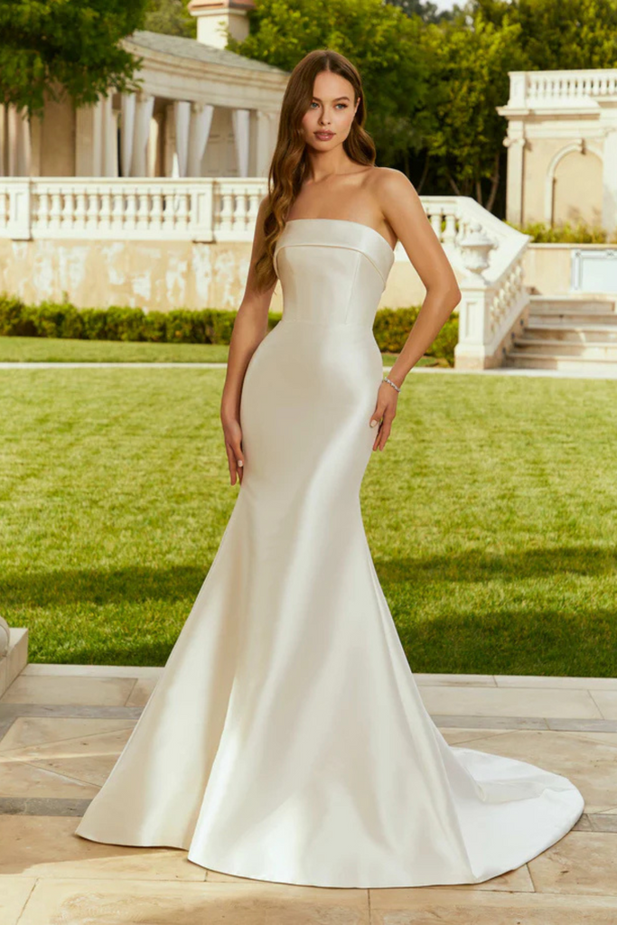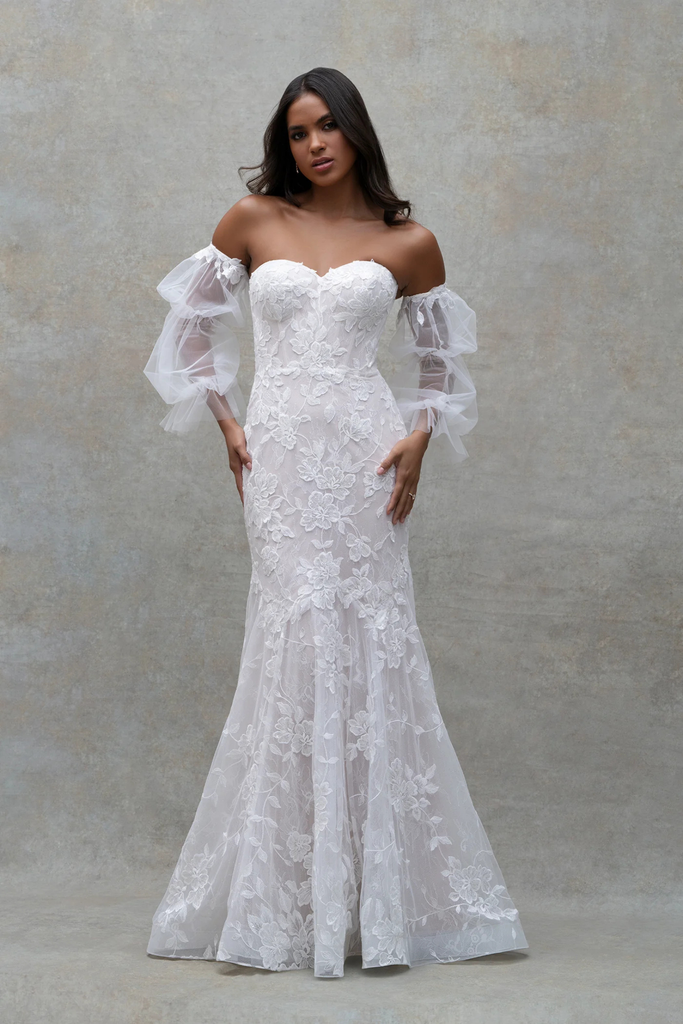 Classic Larissa satin fit and flare with a cuffed neckline and detachable full overskirt.
