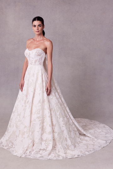 Artistic ball gown wedding dress has a sheer corset bodice with a strapless sweetheart neckline and detachable watteau train in floral pattern burnout organza.