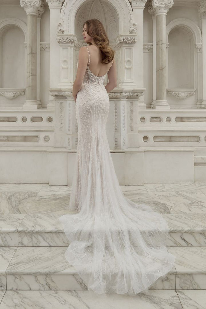 2600 Seraphina is a vision in pearl beading and floral Chantilly lace with silver sequins. Cut from perfecting satin and tulle, this wedding gown features artfully draped pearl strands throughout a fitted silhouette. A structured 16-point boning in the bodice supports her sweetheart neckline, while adjustable beaded spaghetti straps offer additional sparkle and practicality. Featuring a low-scoop back and a pearl beading contouring effect, Seraphina offers goddess beauty in every detail. Inspired by pearls in the sea, she is the perfect gown for an elegant beach wedding, sure to impress guests with her 80-inch train. Brides can also personalize this look further by adding Seraphina’s matching gloves, GL008.