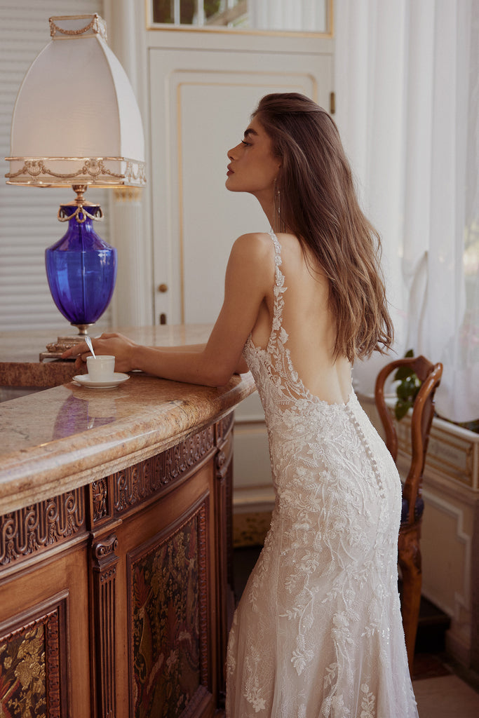 Lace Fit and Flare Gown with Plunging Illusion Neckline and Low Back