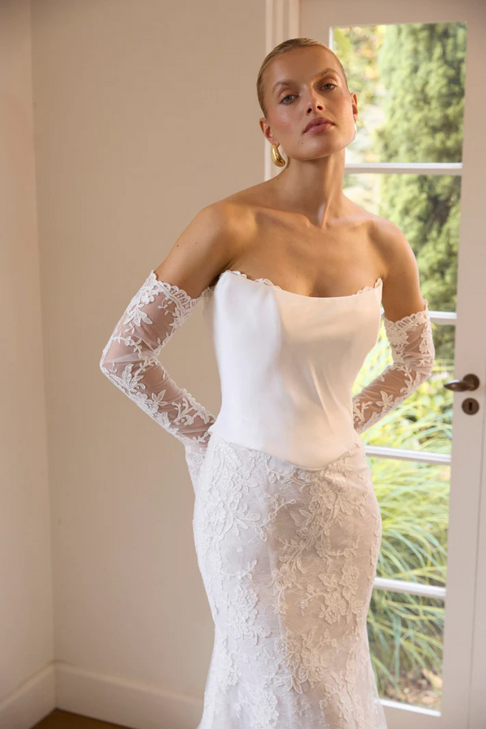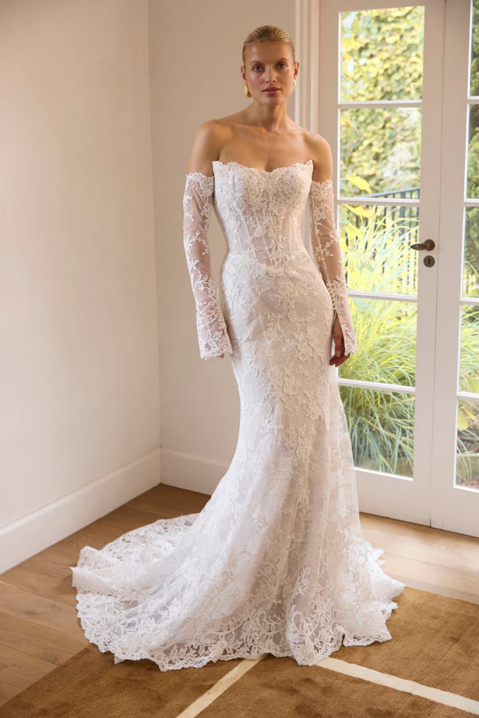 This wedding gown features a modern-classic style, designed to be versatile with multiple styling options. It’s a true Do-It-All Dress with detachable elements like a vest, train, and sleeves, offering the bride flexibility to customize her look throughout the day.