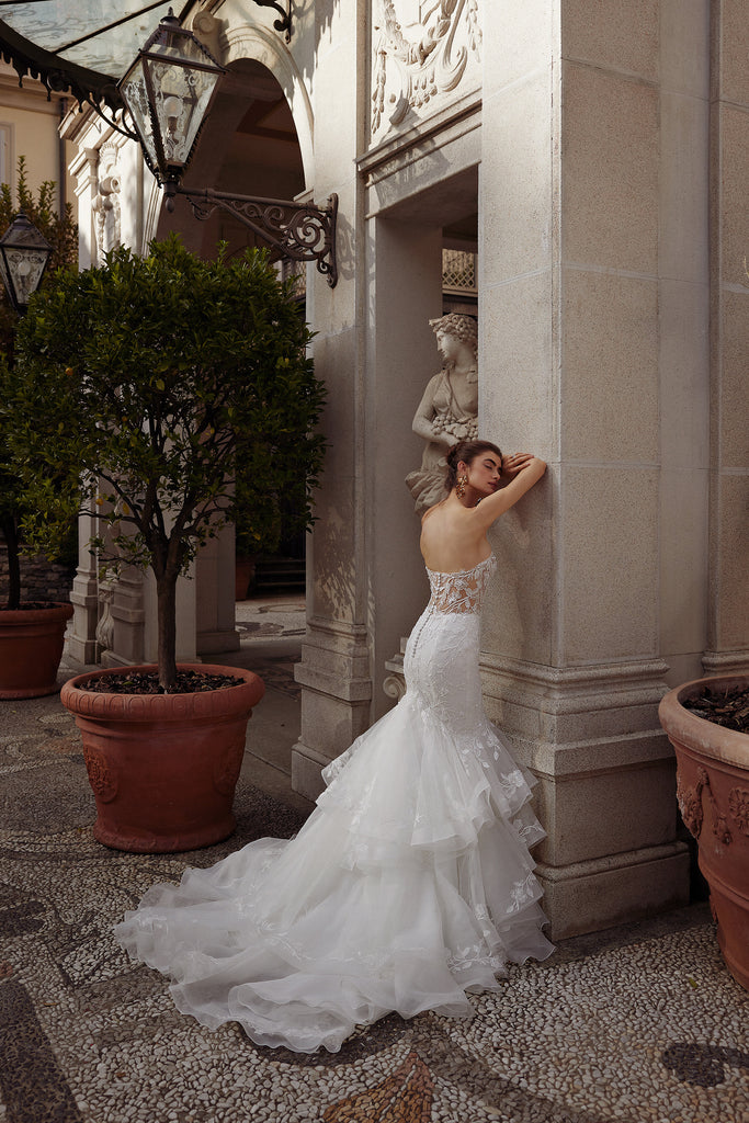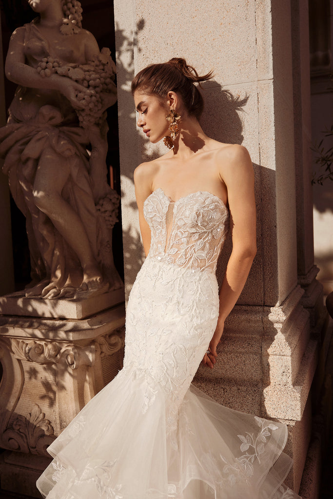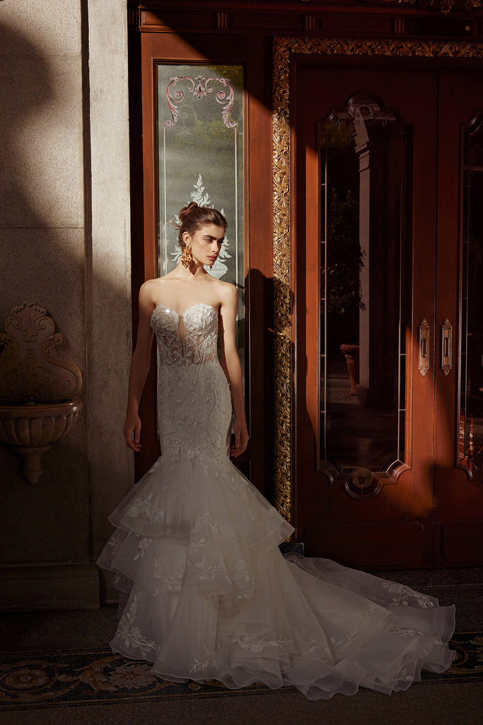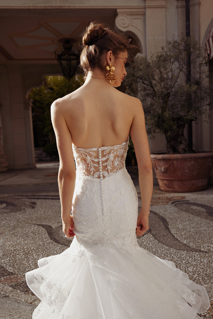 Vestido de Trompeta sin tirantes con falda de volantes y escote profundo