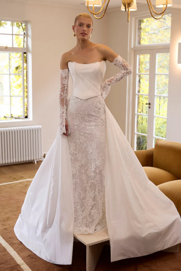 This wedding gown features a modern-classic style, designed to be versatile with multiple styling options. It’s a true Do-It-All Dress with detachable elements like a vest, train, and sleeves, offering the bride flexibility to customize her look throughout the day.