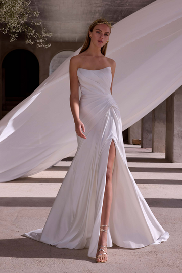 Fit and flare wedding dress has a strapless scoop neckline on asymmetrically draped silky satin.