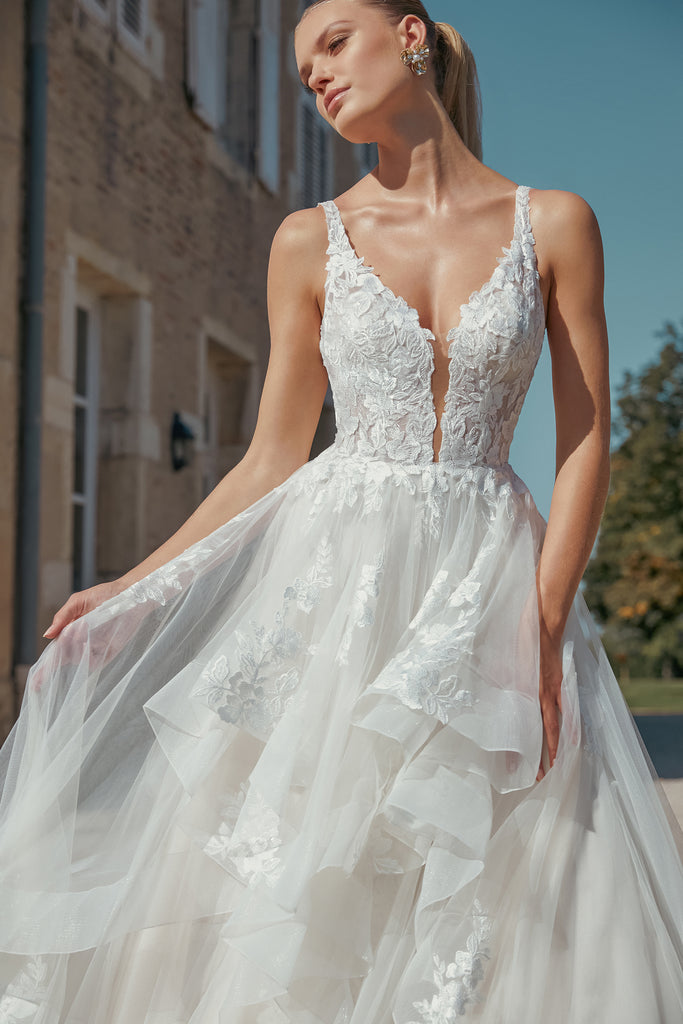 Ruffle Skirt Ball Gown with Plunging V-Neckline and Low V-Back